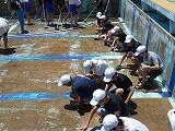授業で使用するプールの清掃を始めています。なかなか取れない汚れに苦労しながら、一生懸命取り組んでいました。